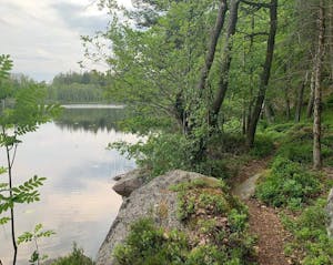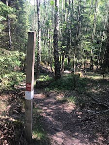 Själva tävlingsbanan på Bocksten Trailrun börjar här med en kortare asfaltssträcka följt av en liten grusbacke och efter 1.5 km ansluter vi till den anrika stigen runt Skärsjön, fast åt ”fel” håll. Först några hundra meter längs Skärsjöns södra strand men ganska snart får vi känna på den första två lite större stigningarna och banans kanske tuffaste utförslöpa efter knappt 4 km. Strax därefter delar sig korta och långa banan, där den korta börjar dra sig tillbaka mot mål medan den långa tar sig in i nästa delstat – Skärbäck!