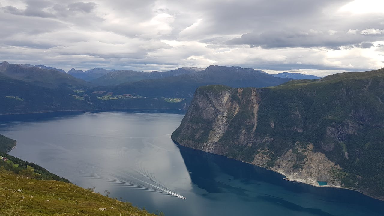 Efter de första kilometerna kom vi upp på Lievarden, 799 m.ö.h. Hade nu varit ute i någon timme utan att ta ett enda löpsteg förutom de få metrarna vid starten. Här var det fantastiska fina vyer och jag filmade och fotade lite (vilket också visade sig bli ett av mina misstag under loppet). Äntligen kom det lite löpbar stig efter ryggen ner mot fjorden. Fantastiskt vackert och skönt att få börja springa. Det sköna varade dock inte många hundra meter innan det var stopp igen. En lång kö framför med folk som började den riktiga klättringen. Det här hade jag inte föreställt mig när jag läst in mig på loppet och höjdprofilen, men arrangören sade under raceinfon att 45 graders klättring väntade. Han skojade inte. Det blev köbildning då alla fick ta ett steg i taget och ta händerna till hjälp. Jag tänkte att det kanske bara var ett brant parti – men vi höll på så i en timme. Jag har aldrig i hela mitt liv sprungit ett traillopp där jag fått köra så mycket scrambling. Efter ett par timmar tänkte jag att detta är inte löpning, det jag gör nu är en vanlig topptur. Klättring som jag brukar göra. Fast i på tok mycket högre tempo och med nummerlapp på.
