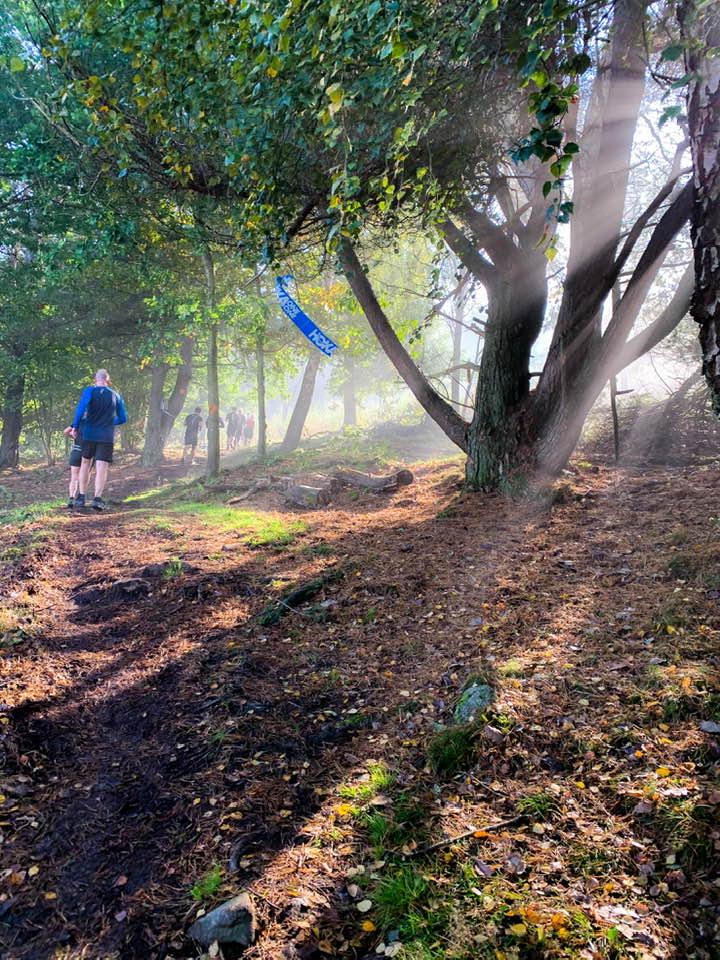 Fortsatt löpning längs kusten på leriga stigar, steniga stränder och genom fantastiskt vackra bokskogar. Dimman låg kvar lite mellan träden, solen sken in genom det höstgula bladverket och skapade ett magiskt sken på stigen. Jag blev sådär betagen så att jag var tvungen att utropa "Åh så fint!" högt till mina medlöpare men de var nog lite för koncentrerade på stigen för att kunna uppskatta omgivningen. Jag njöt för fullt iallafall.