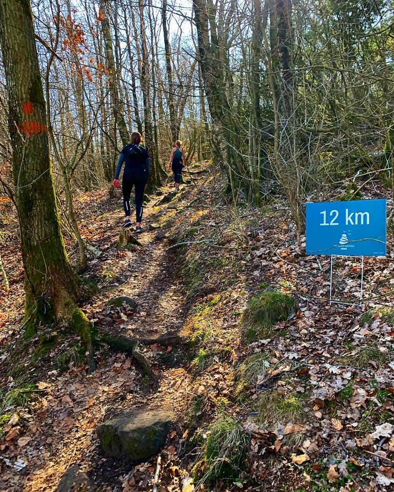 Efter vätskestationen går banan böljande upp och ner genom skog och berg. Några långa sega uppförsbackar där jag gick och sedan lika långa, härliga utförslöpningar där benen vilar. Vitsippor hade slagit ut i en solig glänta och det var stora lövknoppar på bokträden, våren hade verkligen kommit längre här i Skåne än hemma i Göteborg.