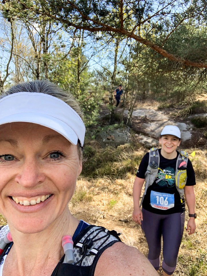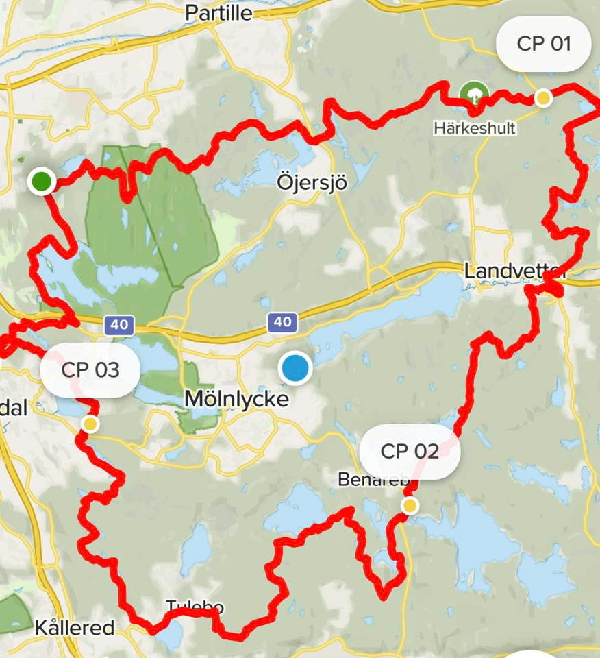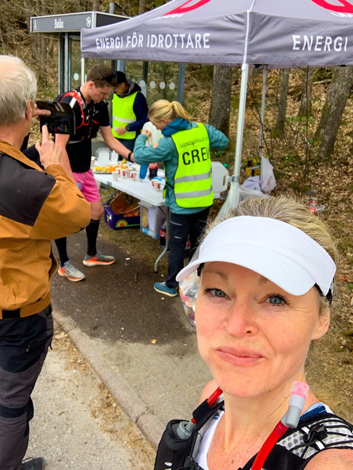 De första 18 km till checkpoint 1 är välkända vägar och stigar ut från Skatås, förbi Kåsjön i Partille och längs Vildmarksleden till Härkeshult. Jag valde att se den delen av banan som uppvärmning och tid till att börja äta och dricka, känna in kroppen och hitta den sköna lunken som jag kan hålla länge. Löpare bakom passerar oss och det är lätt att känna stress över att vi är långsamma, men jag kollar klockan och vet att jag har precis den fart jag ska ha, 7,30 min/km och 1,5 h per mil. Solen stiger, det blir riktigt varmt och vi tömmer våra flaskor. Det kommer att gå åt mycket vätska under dagen! Vi når Härkeshult efter 2h 20 min och välkomnas av vår vän Maria som hjälper oss att fylla på vätska och serverar apelsinklyftor, så gott!