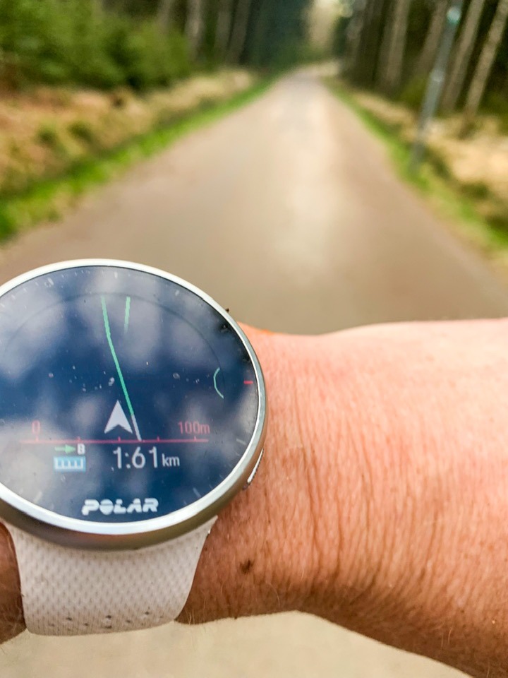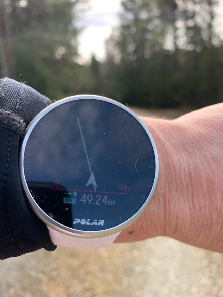 Eftersom banmarkeringarna hade försvunnit på några ställen var det toppen att hela tiden se rutten i löparklockan Polar Pacer Pro. När vi sprang fel vid ett tillfälle signalerade den direkt och vi tappade inte kraft genom att gå tillbaka och leta. Klockan kan även påminna om vätska- och energiintag men den funktionen hade jag inte på. Det var gott om batteri kvar efter 11,5 h och jag hade hela tiden koll på puls, fart och distans. Så härligt när jag ser kilometrarna ticka ner och målet närma sig!