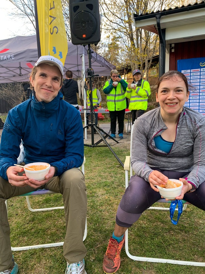 Både Sara och jag är lite medtagna och det uppfattar funktionärerna. De fyller våra flaskor, ger oss buljong och banan och vi sitter en stund och vilar. Låter den underbart goda avslagna colan sippra ut energi i kroppen och jag kostar på mig att besöka en riktig toalett. Sköljer händerna, så skönt. Jag brukar vilja göra depåstoppen så snabba och effektiva som möjligt men den här gången låter jag det ta tid. Vi har legat på energimässigt minus och nu laddar vi upp igen. Sara dricker massor och plockar med sig av det goda som serveras. Jag har bara druckit men packar upp en barnmatsklämmis ut ryggan och tar en näve chips. We are ready to go! 13 kilometer kvar. 13! Ingenting ju! Jo, den brantaste och längsta backen är kvar.