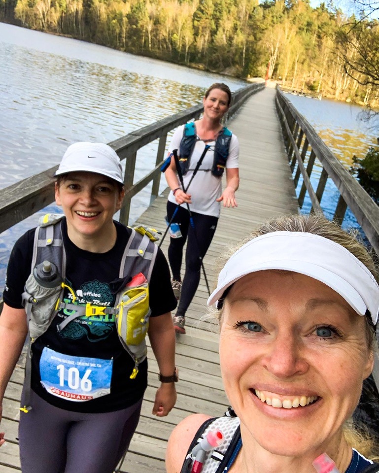 Efter 11 timmars löpning når vi Delsjön och gångbron över vattnet. Äntligen! Solen står fortfarande rätt så högt och det visade sig vara alldeles onödigt att packa med pannlampa. Samtidigt var det ett tecken på att vi hade bestämt oss för att nå mål, oavsett hur lång tid det skulle ta. Och här var vi nu, med tre timmars marginal, nära målgång. Sara led av stora blåsor på fötterna och skav på nya ställen som inte blivit smorda, jag hade haft några timmars dipp med illamående men just piggnat till och kände mig stark och glad igen. Sara hade redan slagit distansrekord och jag skulle snart få veteran-SM bronsmedalj, men det visste jag inte där på bron. Vi var bara så jäkla nöjda med våra prestationer under dagen!