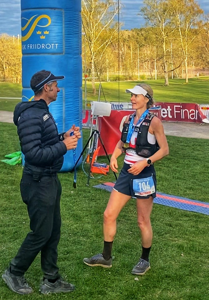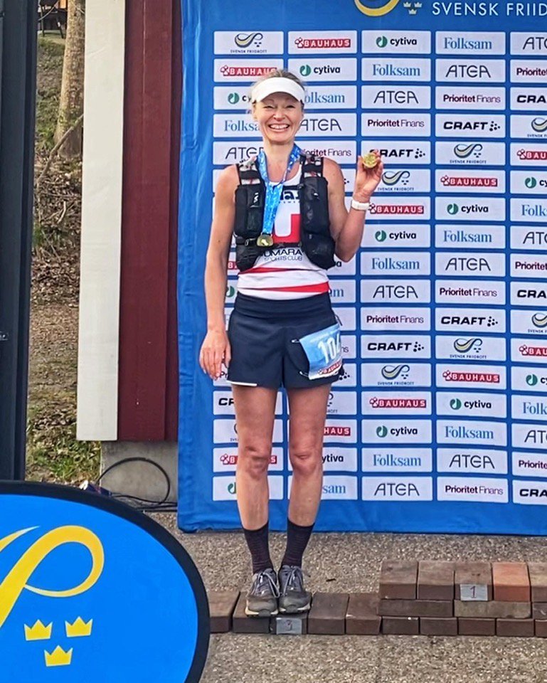 Jo, vi var fem anmälda damer i min åldersklass men bara tre startade. Vilket ger mig bronsmedalj i Ultratrail SM, veteranklass 50-54 år. Av 21 damer som fullföljer loppet är Sara på plats 17, jag på plats 18 och alltså trea i min ålderklass. Min första och troligen enda VSM medalj!