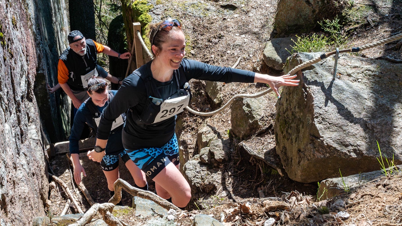 – Nu närmar sig den första vätskekontrollen, du når den efter 8,5 km vid scoutstugan vid Gransjön. Här passar det bra att fukta strupen och få lite energi för nu följer ett tufft avsnitt. Det bär uppför i ca 1 km till Kolmårdens högsta topp som ligger 171 m.ö.h. Väl uppe på toppen kan du njuta av utsikten över Ågelsjön. På väg nedför passerar du eremitens Jakobs grotta som ligger på höger sida under en stor granitklippa. Stigen fortsätter genom ”koklämman” där en vänlig själ har placerat ett rep, så att man kan hjälpa till med armarna för att dra sig upp. Väl uppe är du på en bergsplatå med fina småstigar och 60 meter ner skymtar Ågelsjön.