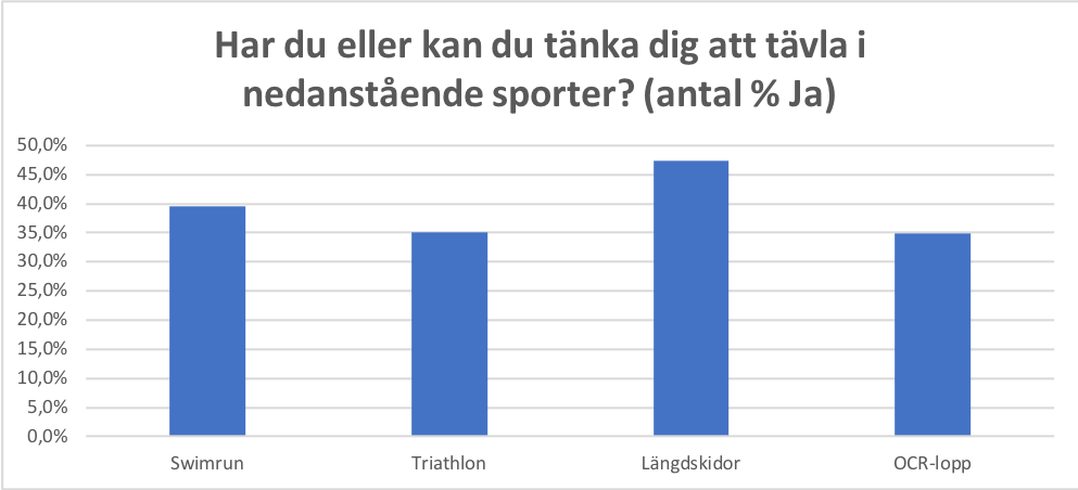 Längdskidor är den sport som ligger närmast tillhands att tävla i, 47 procent har deltagit i ett skidlopp, följt av swimrun (40%), triathlon (35%) och OCR-lopp (35%).