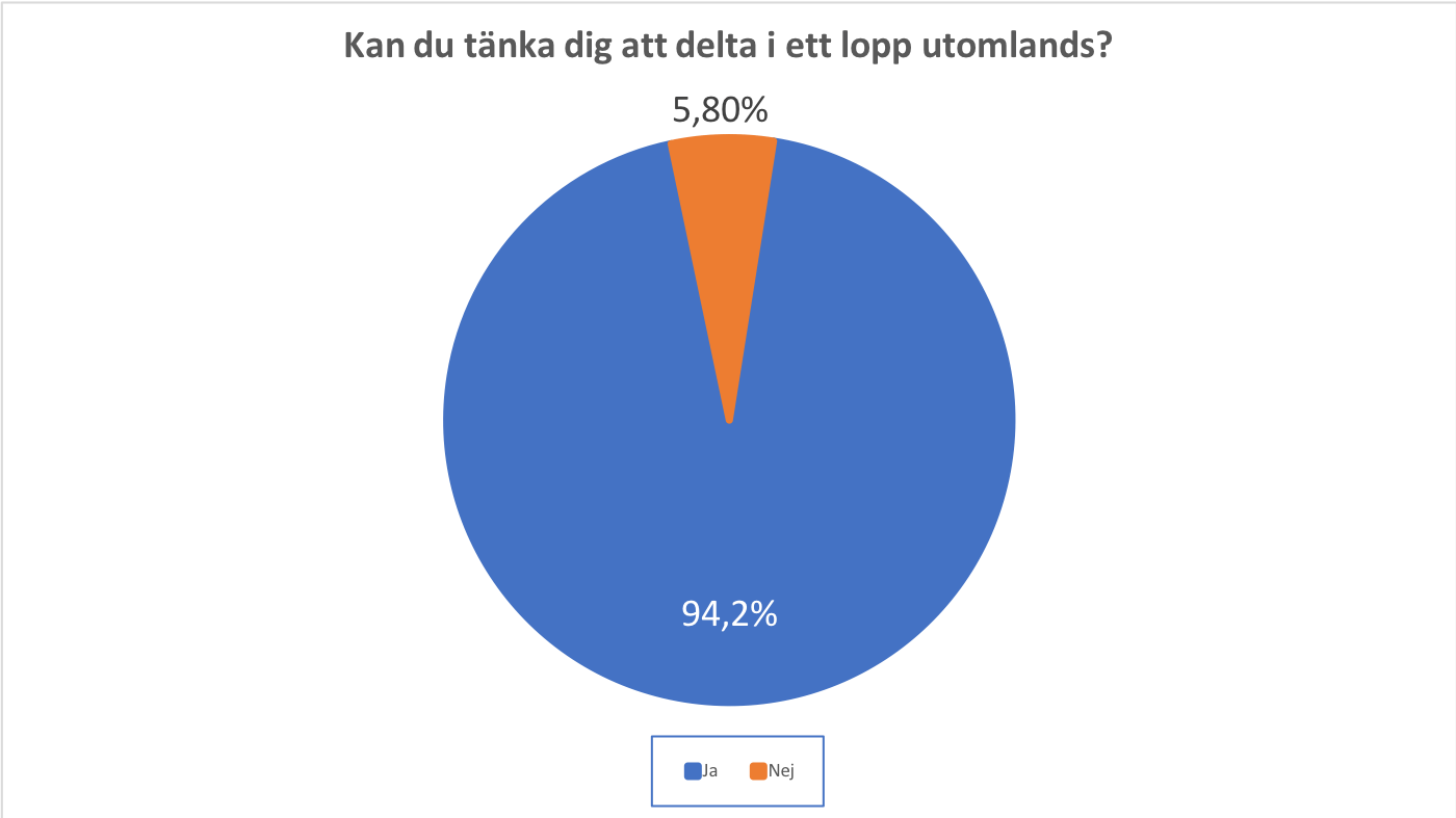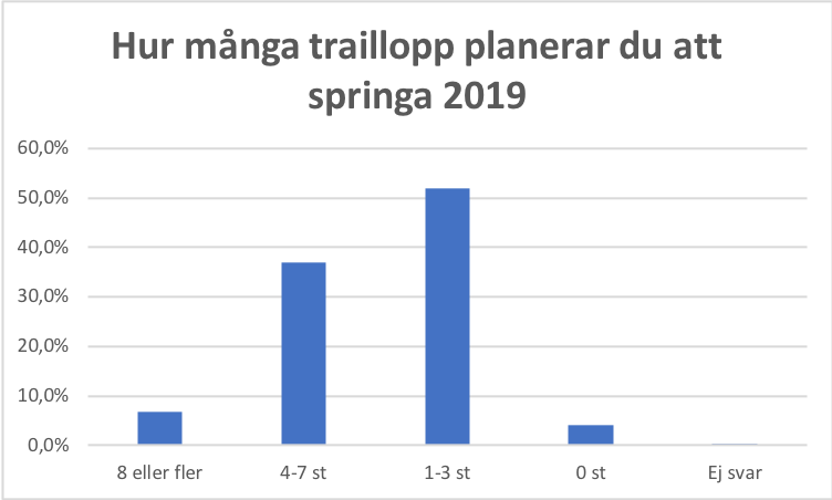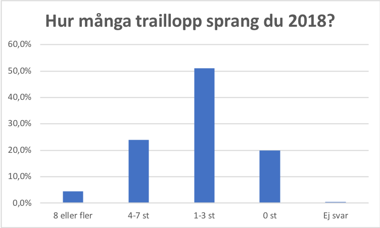 51 procent sprang 1–3 traillopp 2018, 20 procent tävlade inte alls, medan 28 procent sprang 4 eller fler lopp. Inför 2019 är det fler som planerar att tävla, totalt 96 procent tänker sig minst en start i ett lopp. Många drömmer om fjällen, 94 procent kan tänka sig att starta i ett fjällmaraton, lika många i ett lopp utomlands.