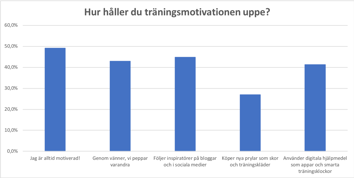 Traillöparna sliter inte med motivationen, nästan hälften (49%) säger att de alltid är motiverade. Men om det ändå behövs lite extra pepp, så är de främsta sätten att hålla träningsmotivationen uppe att följa bloggar och inspiratörer på sociala medier (45%), följt av att peppas av vännerna (43%). 41 procent använder digitala hjälpmedel som appar och smarta träningsklockor, medan 27 procent köper nya prylar som skor och träningskläder för att få motivation till träningen.