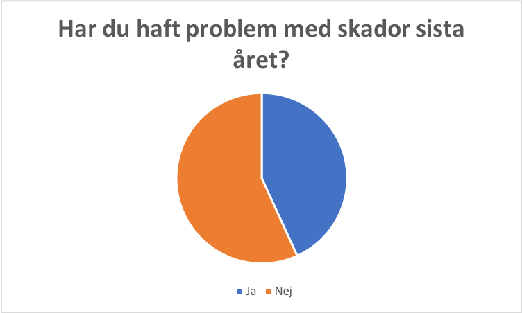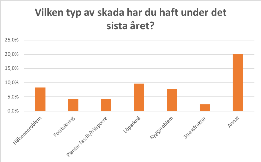 Så till den tråkiga sidan av traillöpningen, 43 procent har haft problem med skador det senaste året. Löparknä är den vanligaste skadan, följt av hälseneproblem och ryggproblem.