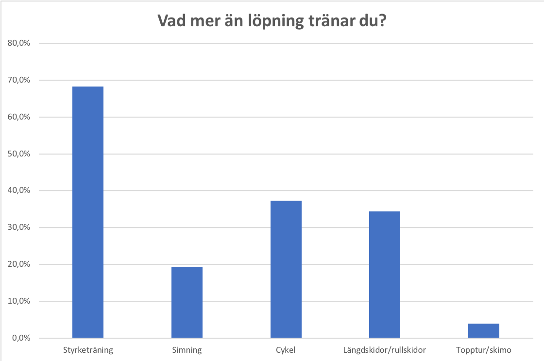 Hela 68 procent kompletterar löpträningen med styrketräning, 37 procent cyklar och 34 procent åker längd- och/eller rullskidor.