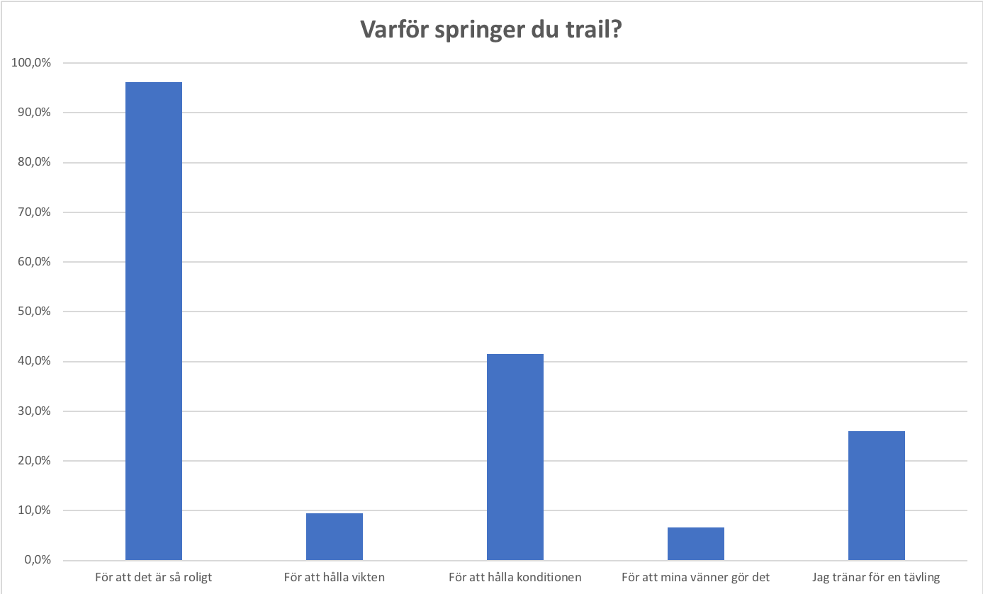 Undersökningen från Trailrunning Sweden visar att 96 procent av de svenska traillöparna springer i skog och mark för att det är roligt. Lika många säger att det är upplevelsen i löpningen som är det viktiga för dem. Undersökningen visar också att fler planerar att delta i ett traillopp under 2019, hela 96 procent. 2018 deltog 80 procent i ett lopp.